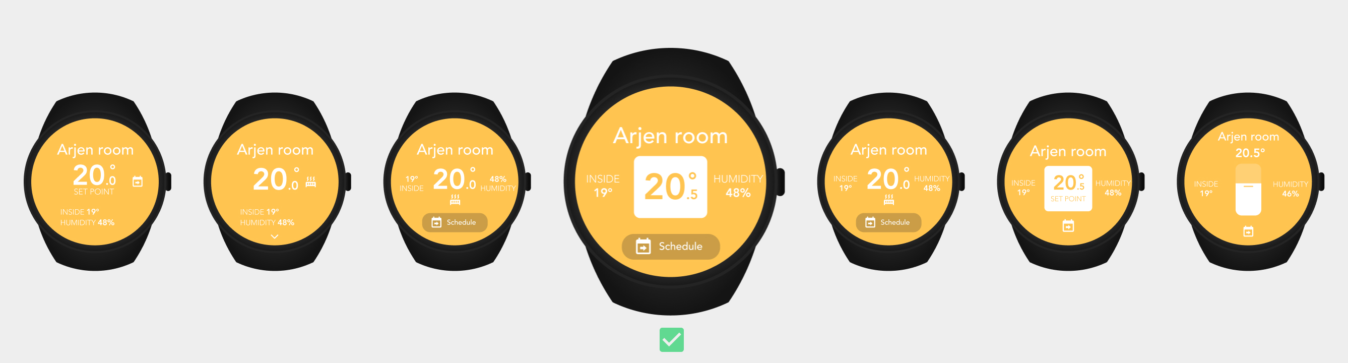 I made different screens and tested them with users. Two were the main discoveries: users prefer to access to the set point temperature control via an extra step instead of having it directly accessible from the room screen and users prefer the button represented with an icon and the "Schedule" text, the use of only the icon has led to misleading results.