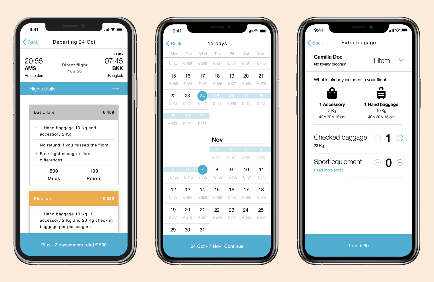 For instance, in the "Extra Luggage" step, we display the luggage included with each passenger's fare, using intuitive icons for quick understanding. On every screen, you can easily find the relevant prices: the cost of a single flight, the price for each route (departure and return), and the breakdown of prices for any added extras.