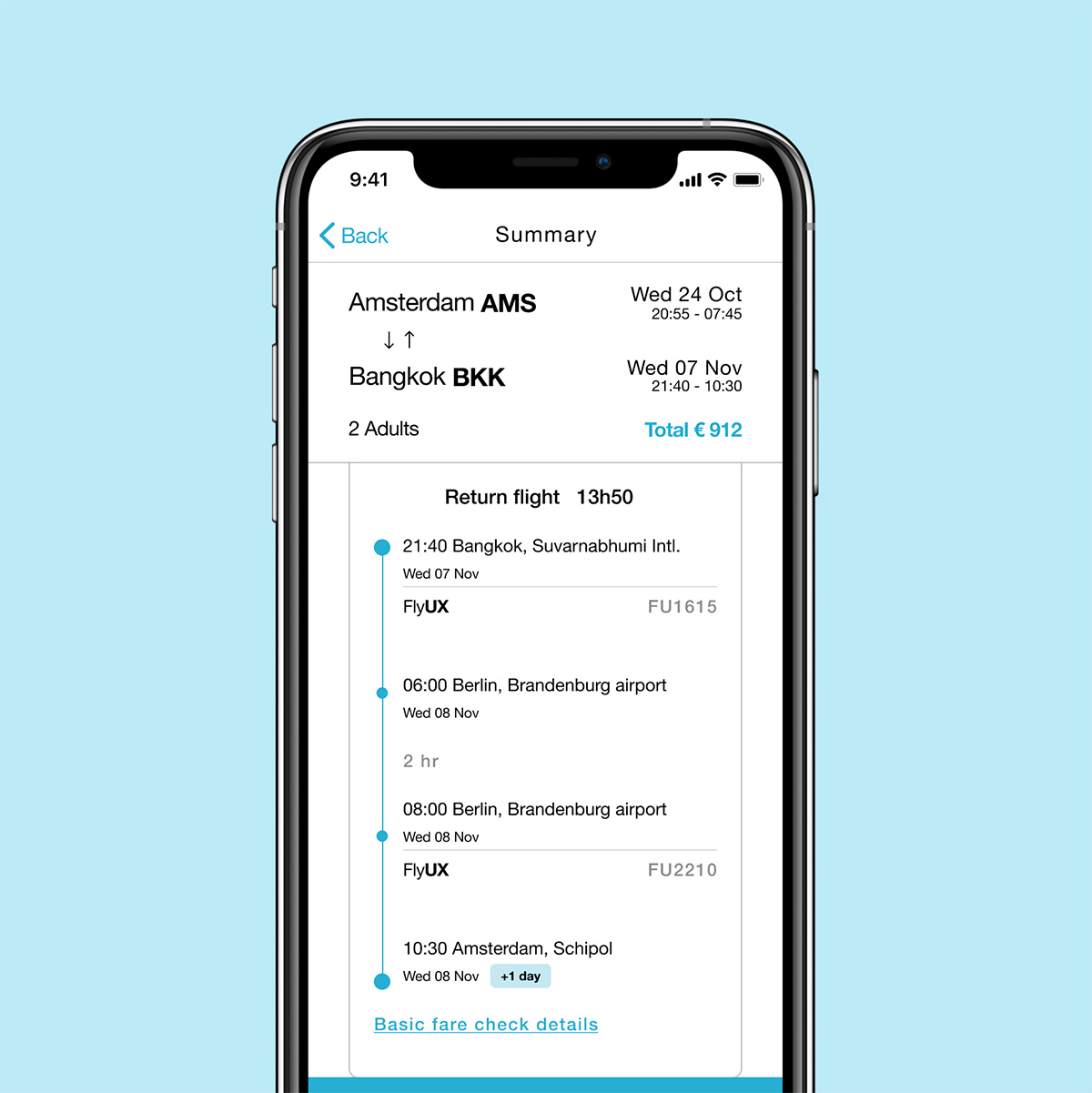 From the research phase, it was clear that people get really frustrated, till the point they are willing to leave the app or website, if they unexpectedly find out important information that was not well communicated. Information about stop overs and airport transfers should never be hidden in the hope to sell a ticket. These should always be communicated in a transparent way, building a trustful relationship with our users.